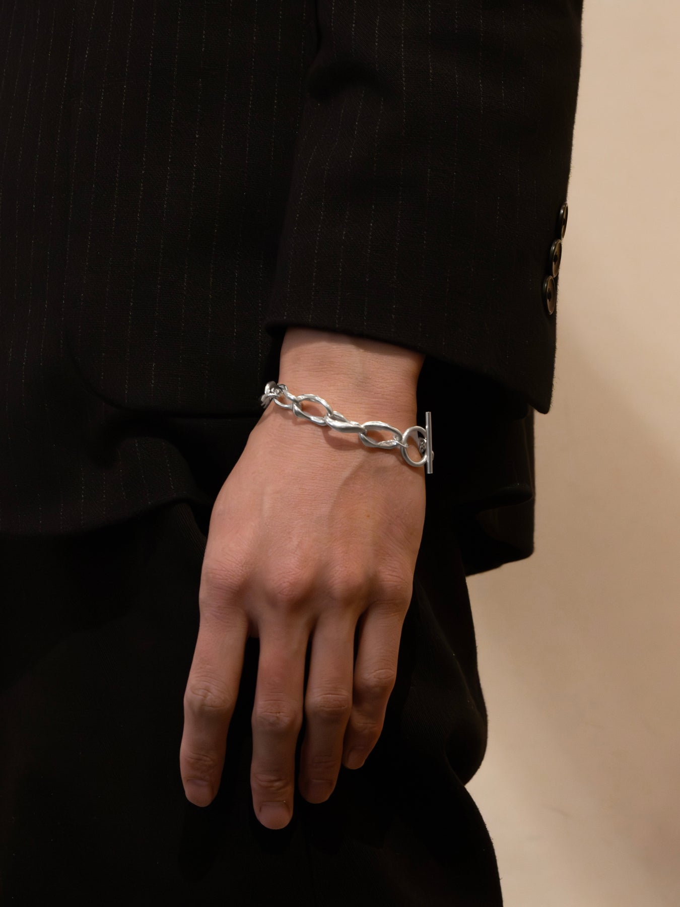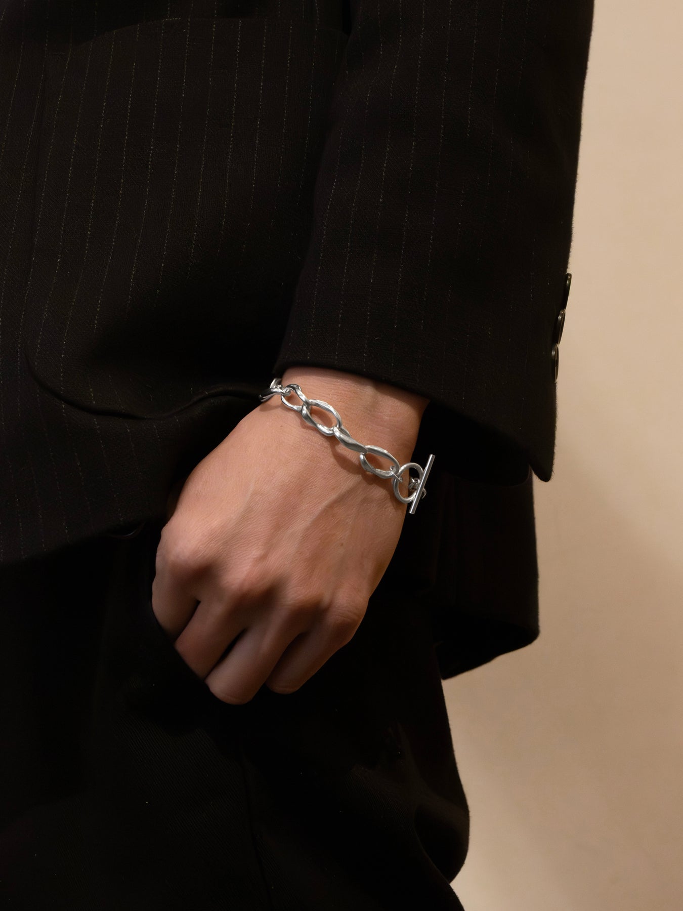 これ一つでも十分な存在感がありますが、細身のバングルなどと重ね付けもおすすめです。